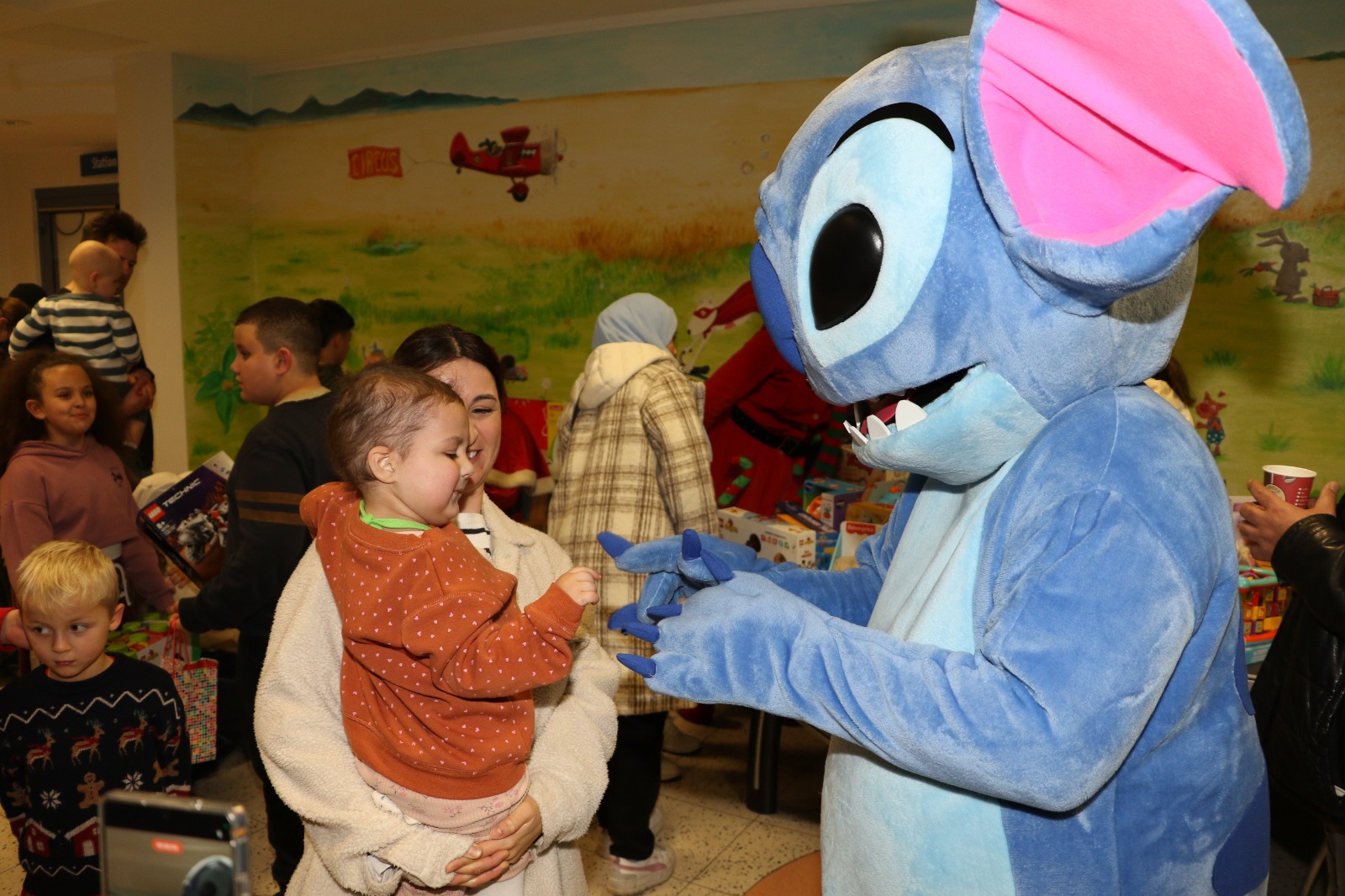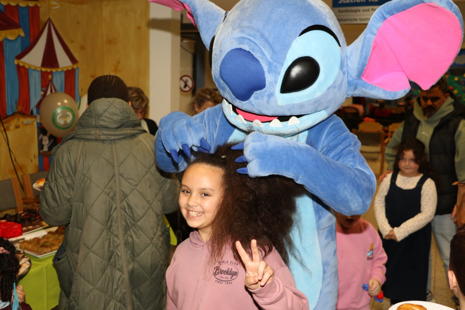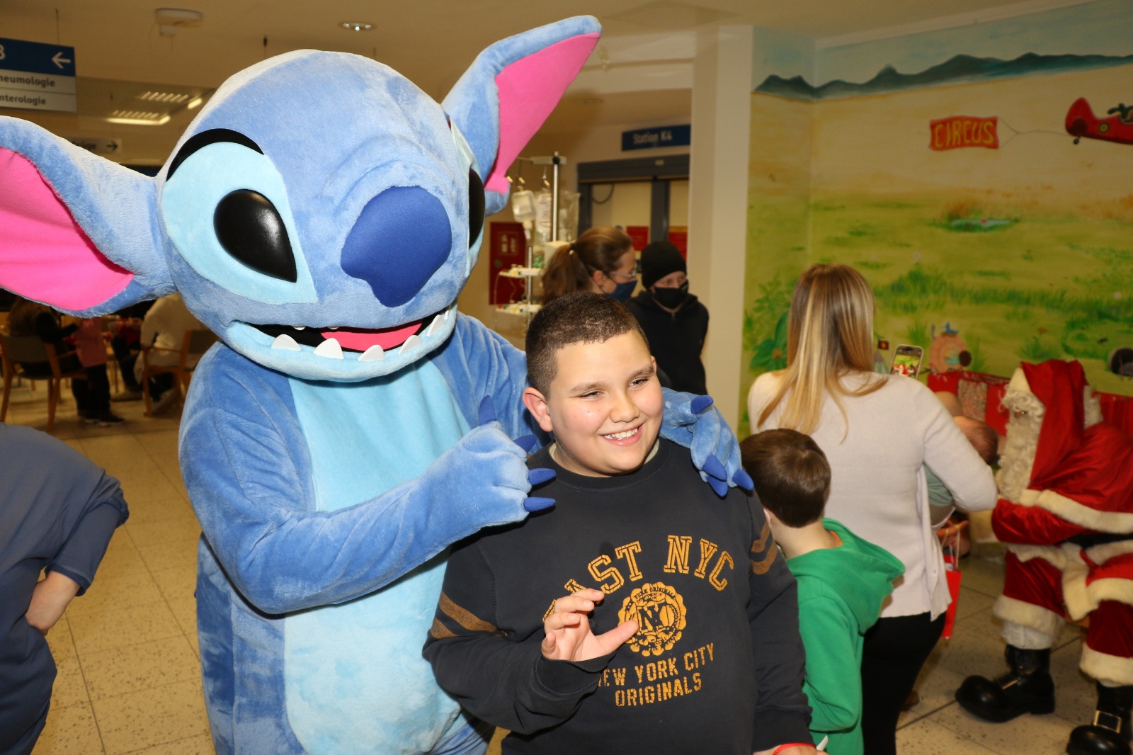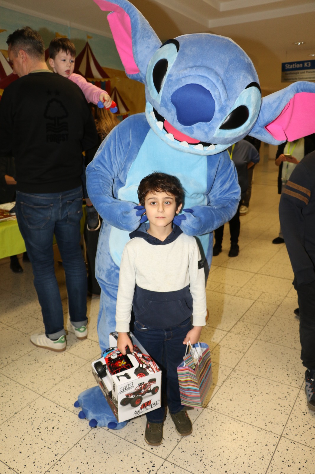 Dann wurde es festlich und magisch zugleich: Der Nikolaus besuchte die Station und hatte nicht nur Zeit für liebe Worte, sondern auch für strahlende Kinderaugen. Jedes Kind durfte sich über liebevoll ausgewählte Geschenke freuen – kleine Aufmerksamkeiten mit großer Wirkung. Zusätzlich erhielt jedes Kind eine prall gefüllte Tüte mit Süßigkeiten, die für viele ein Stück unbeschwerte Freude bedeutete. Als schließlich Stitch erschien, war das Glück vollkommen – Kinderlachen erfüllte den Raum, und für einen Moment schien alles andere in den Hintergrund zu treten.